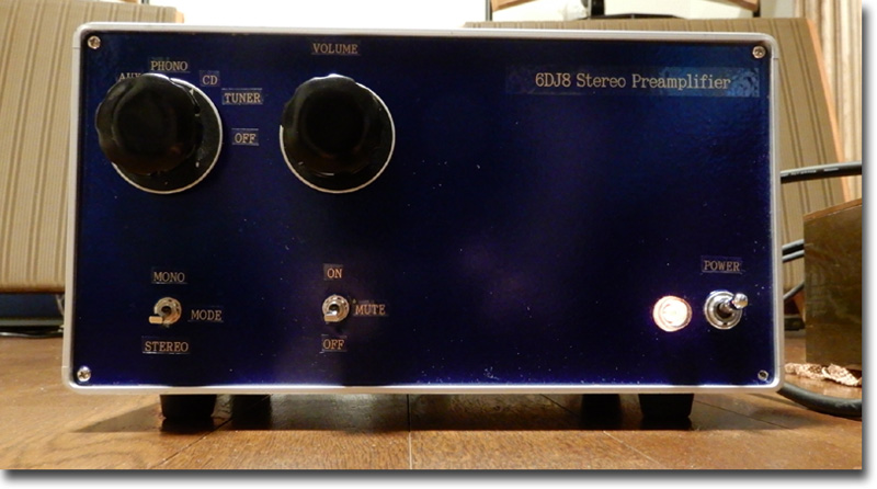 | 友人の依頼で作成したプリアンプ。双三極管6DJ8の2つのユニットの間にCRを挟んだCRタイプイコライザーです。インプットセレクタ、音量調節ボリュームを経て、同じく6DJ8SRPPバッファで送り出し。 つまみは入力セレクタとボリューム、ステレオ⇔モノラル切替のモードスイッチとミュートのみのシンプルな構成です。回路は『Valve'sWorld』様の回路を参考にさせて頂きました。入力はPHONO,CD,FM,AUXの4系統。これでCDやFMはもちろん、アナログレコードも楽しめます。 |