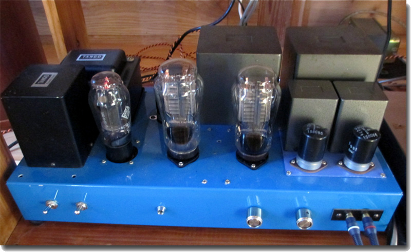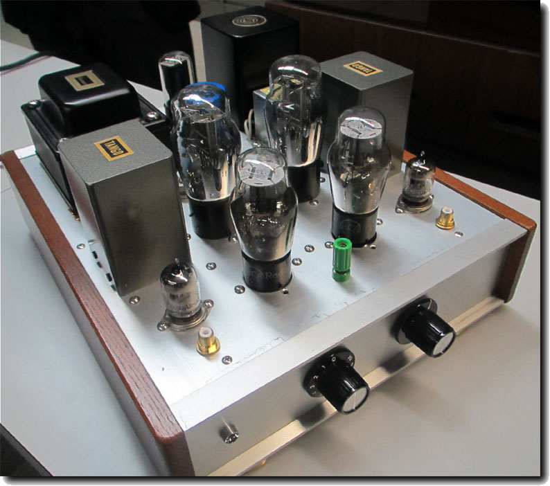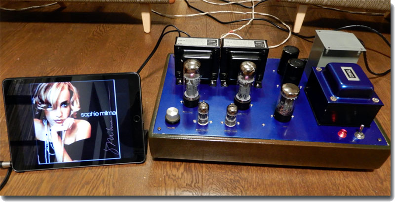 | 木製のハカマを作って上面に2mm厚のアルミ板を付けた構造のシャーシーで簡単にしかも安価に製作できます。出力管は6CA7(松下製)。松下の6CA7は作られた数が多く、ヨーロッパにもOEM供給されてました。このため、こなれていてバラつきが少なく安心して使えます。今回は3極管接続としています。6CA7の3結はドライブがし易くクオリティも優れています。初段/ドライブは12AT7のSRPP、整流管は定番の5AR4。OPTはタンゴの808です。iPADでソフィー・ミルマンのボーカルを再生中。 |