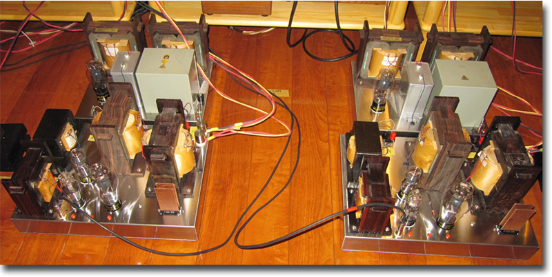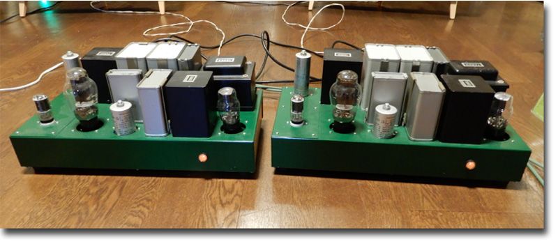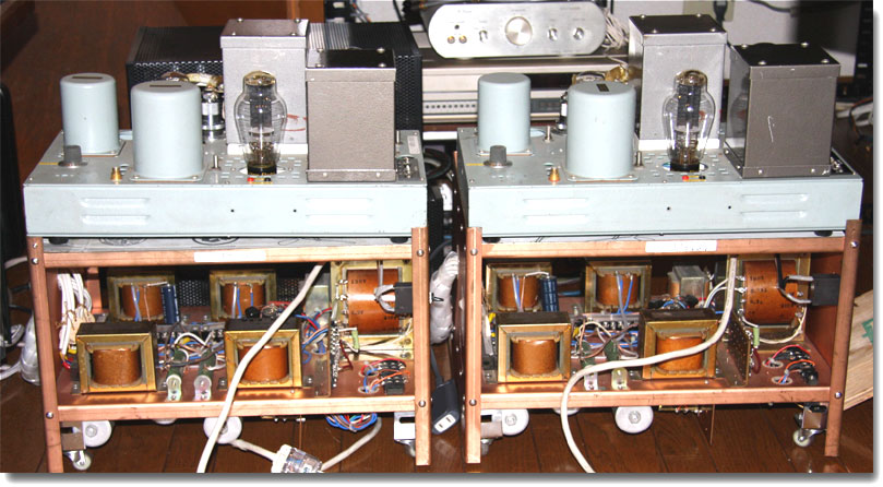 | カンノ式WE300Bシングルモノラルアンプ × 2 とその電源部(下部) |