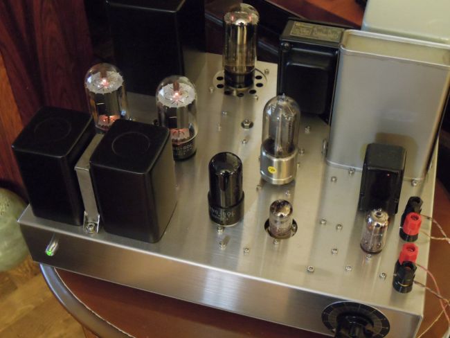 | 米国アイマック社の送信管100TH(日本名:4T17)を使ったシングルモノーラルアンプです。プレートはタンタルプレートです。タンタルプレートの真空管は音が良いと言われています。初段はロクタル管7N7、ドライブ段は6L6GCでカソードチョークドライブ、カソードチョークは春日無線製を使っています。出力トランスはタンゴのXE60-3.5。シャーシーは木枠を友人に作って貰い、その上にアルミ板を載せています。回路は柳沢正史さん発表の回路をアレンジしたものです。出来上がったばかりでしたが、9月17日のレコードコンサート、『松任谷由実と中島みゆき』特集で使用しました。十分に慣らし運転が出来てないせいか、全体的に高域寄りの音でしたが、コンサートで使用しているうちにどんどん音が良くなっていきました。更に鳴らし込むと重心が下がっていくでしょう。高域は送信管に共通する、華やかな音でした。 |