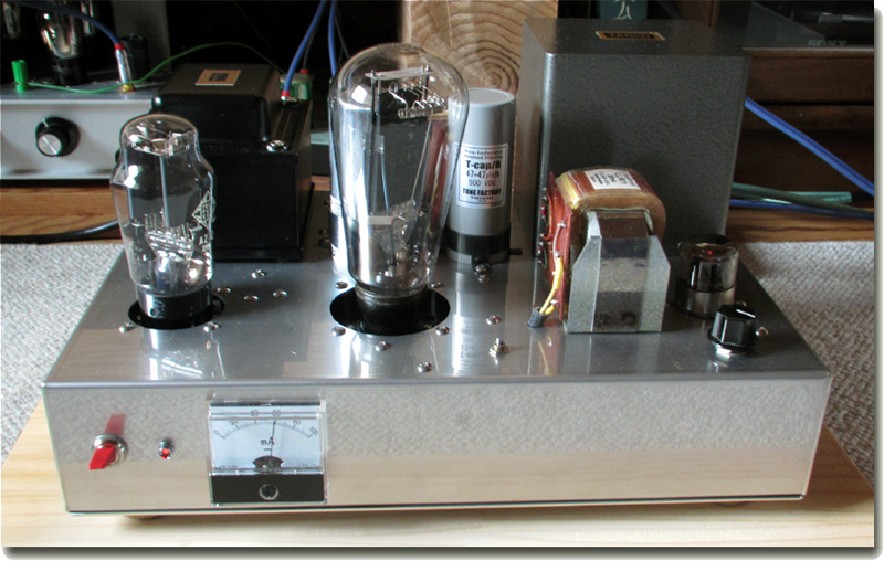 | 真空管300Bは現在ではたいへんポピュラーな球になり、本家のWE以外でもチェコや中国、更には日本でも、たくさんの種類の300Bが作られています。本機は中国製300Bを 使ったシングルモノラルアンプです。コンデンサはオイルコンとフィルムコンを使用してあり、電解コンデンサは使っていません。初段は6SN7としたオーソドックスな回路で、整流管は80です。 |