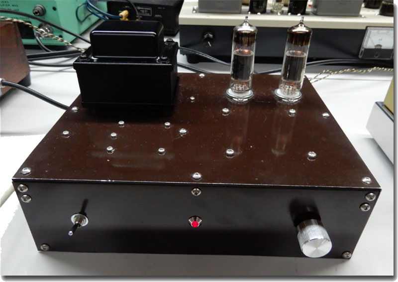 5691のSRPP増幅…5692のトランス負荷600Ω出力…LCRイコライザー素子…45シングルのトランス負荷600Ω出力…東京光音のH型アッテネーター。5691の前段に6DJ8のSRPP増幅のヘッドアンプ(MCカートリッジ用)を組み入れている。イコライザー素子のコイル(エナジー製)は大型で、4個のうち2個をシャーシ内に取り付けているためシャーシ高が12センチで高い。電源は別シャーシ。写真の後方が電源部。回路図はココを参照。
