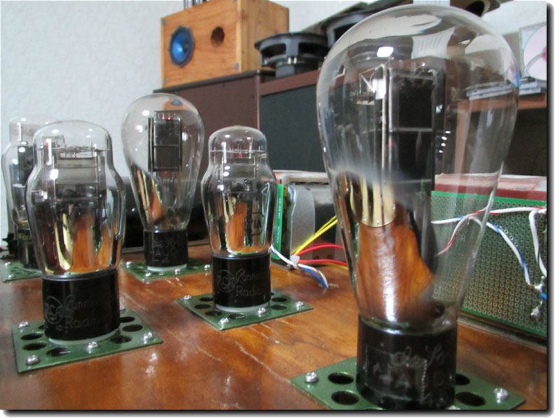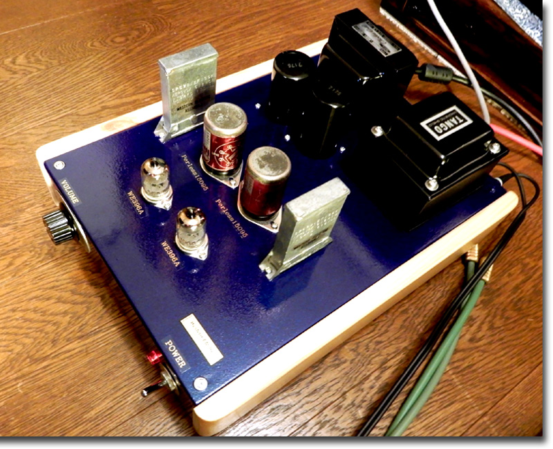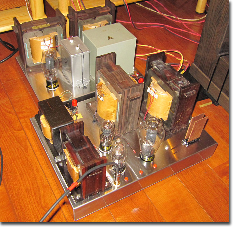 真空管はすべてウエスタンエレクトリック製。 入り口からWE262B-W336A-WE300B。整流管はWE274A。段間はプレートチョーク結合およびトランス結合。チョークおよびトランス類は全てエナジー製(木ボビン)。ケースに入ったトランスとは比べ物にならない抜けの良い音を再現します。電源部を別シャーシーにしたのでステレオで4シャーシー構成。B電源はチョークインプット方式のWチョークで、300BはこだわりのAC点火。原寸大の実態配線図を起こして内部配線の長さを決め、約80年前のウエスタンエレクトリック製トランスの巻き線を利用して配線材を手作り。メッキを剥ぎ落として酸化する前に柿渋を塗装、絹糸を巻いて固めてあります。このメッキの?ぎ落しに最大の時間を費やしています。また、抵抗はWEの38抵抗や63抵抗、板抵抗、スプラグのブルージャケット抵抗などを場所によつて使い分けるなどたくさんのノウハウが入っています。