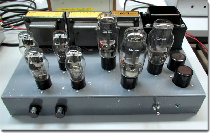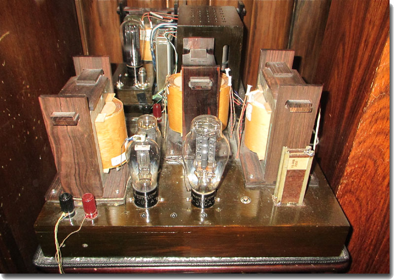 カンノの入力トランス…WE262B…WE336A三結…タンゴNC-14による位相反転…WE300Bプッシュプル…デンマークのJS出力トランス。電源にはルンダールのチョーク、整流管はWE274A。WE86アンプの回路を基本にしている。 |