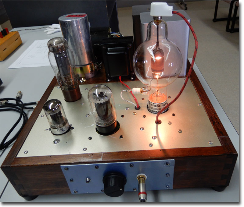 | トリタン(トリウムタングステン)フィラメントのVT-62/801Aを使ったシングルアンプです。VT-62は高電圧小電流動作の小型送信管で、キラキラと輝くような高音部が人気の真空管ですが、下手をするとブリキのような音になってしまいます。しかし、これは電流を多く流すことで対処できるようです。プレート電流を30mA程度流したいところですが、本機は依頼品のため、真空管の寿命を考慮して25mAにとどめています。VT-62のトリタンフィラメントの光りに負けないように整流管はガス入り冷陰極整流管CK1006を使い、光物アンプになりました。また、初段は6188/6SU7のSRPPとして低インピーダンスでドライブしています。 出力が2ワットしかありませんが家庭で高能率のスピーカーを鳴らすには十分です。4月8日の『宮崎ジャズデイプレ・レコードコンサート』で、ちょっとだけ使用しました。100名ほど入る宮崎県企業局県電ホールでは今少し出力が欲しい感じがしました。詳細はココ |