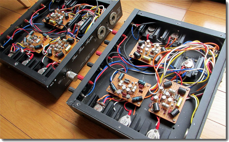 4シャーシー構成の大掛かりなアンプになりましたが、一つのシャーシーに電源部を左右チャンネル分、共用したステレオアンプとは別次元の音がします。
