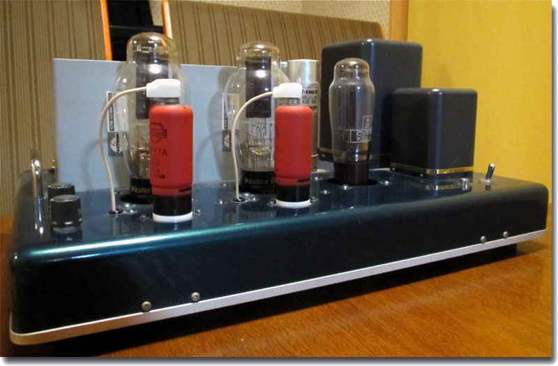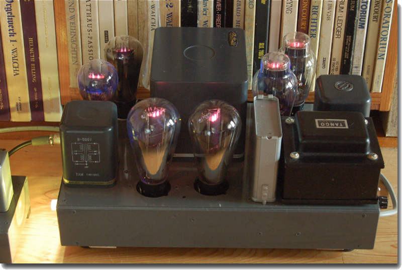 | もとは、サンオーディオのSV-2A3(2A3シングルステレオアンプ)です。SV-2A3をもとに出力管を6CA7に変更。初段は6SL7、ドライブ段は6SN7のカソードフォロアードライブ。この出力トランスは2A3用として60mAは流せるようですがそれ以上流すと途端に低音が出なくなります。それで、ここでは55mA流すようにしています。電源トランスも2A3用として設計してあるために電圧が低いので固定バイアスとし、更にダイオード整流として何とか必要電圧を確保しています。出力は6W弱。一番右の整流管はダミーです。 |