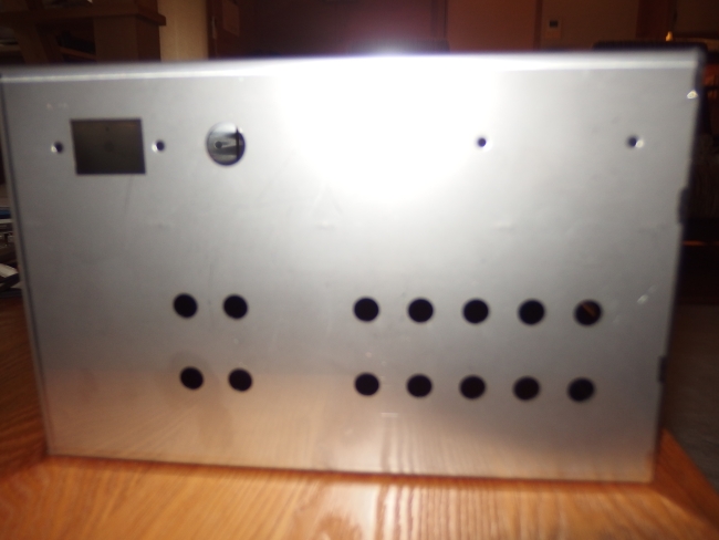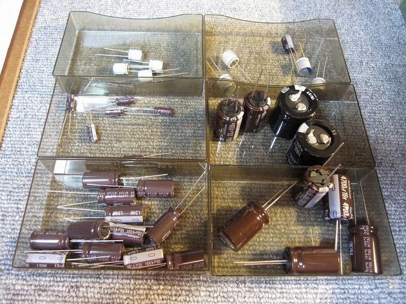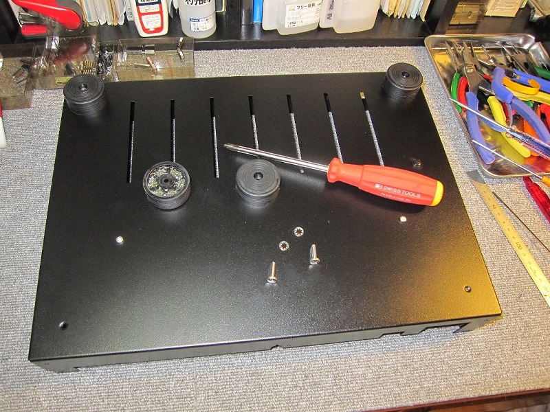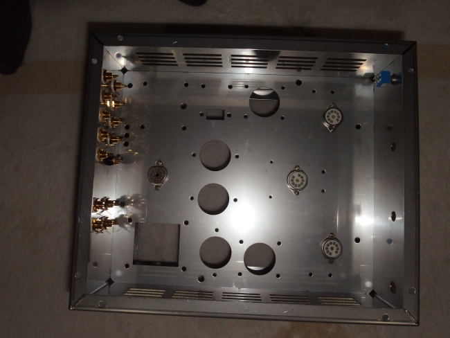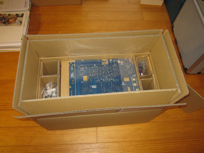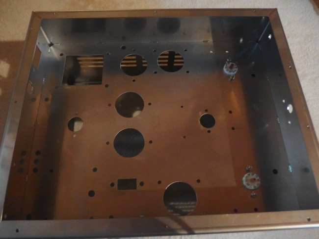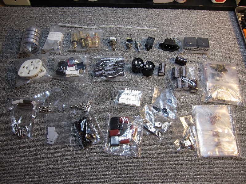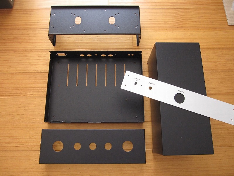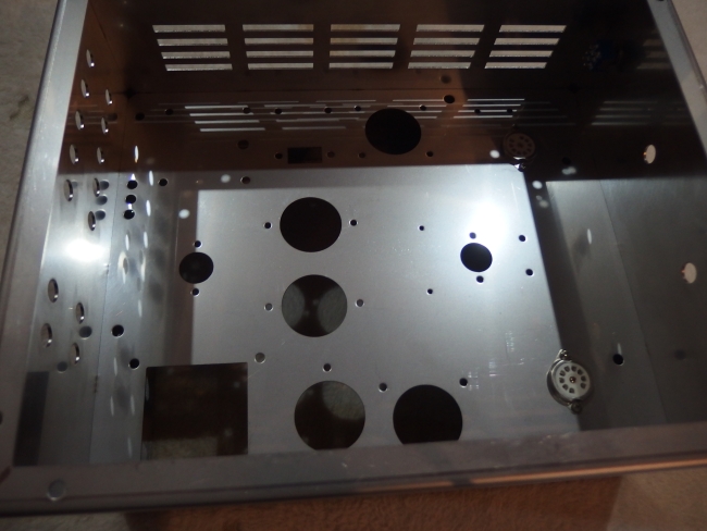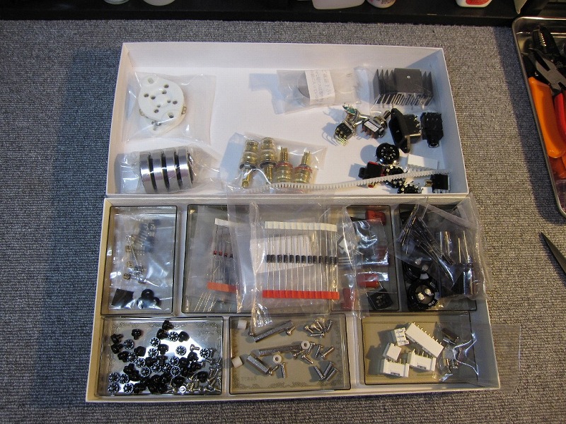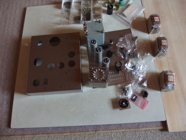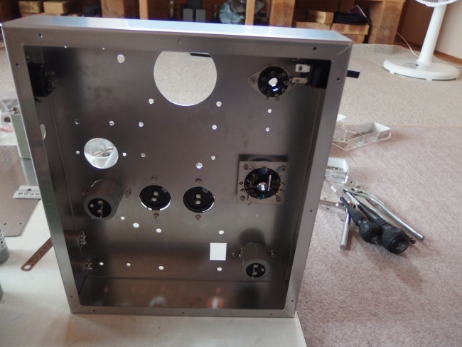 特注のステンレスシャーシが到着し、トランス、コンデンサ等の部品がようやく揃い、今日から製作開始です。 |