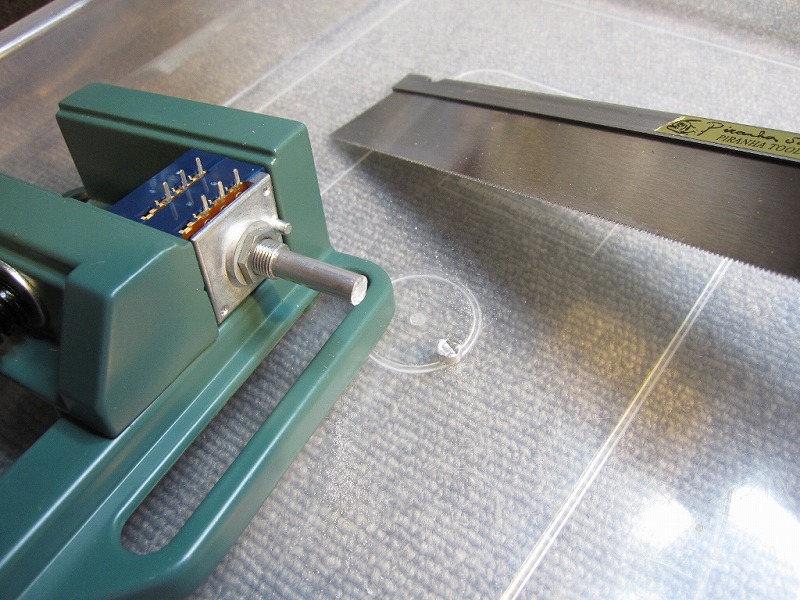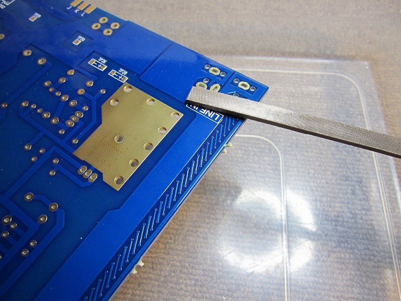 6CA7のソケットをシャーシから1センチほど下げる工作。6CA7はベース部、ガラス管部とも直径32~33ミリあるので、シャーシ既存の50CA10ソケットの穴直径30ミリを直径37ミリ程度に拡大する。半丸ヤスリを使っての作業はシャーシが鉄のためけっこう手間取る。 |