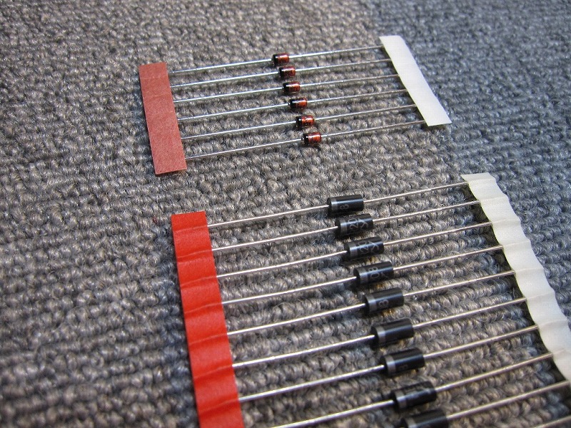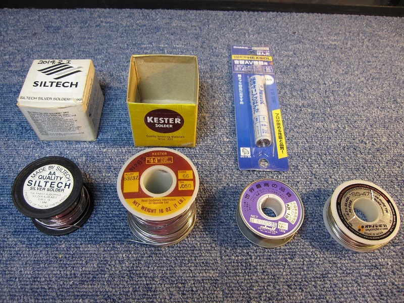 左から、SILTECH社銀入りハンダ(オランダ、今回使ったもの)、KSETER社44型(アメリカ、エレキギター愛好家にファン多し)、日本アルミット社KR-19(オーディオ用の定番)、オヤイデ社SS-47(日本、これのみ無鉛ハンダ、オーディオ用開発品)、上段、ハッコー社音響AV機器用(日本、銀入り)