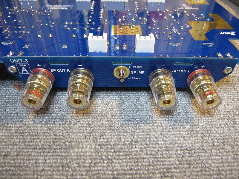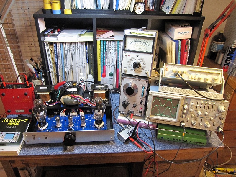 まず入力をショートして出力(SP端子)にダミーロードを繋ぎ、残留ノイズをミリバルで測定します。このアンプは徹底的にノイズ対策をしており、仕様では残留ノイズ:36μVrmsとなっています(μは百万分の一単位、rmsは交流電圧実効値)。通常はmV単位(千分の一)ですから恐ろしく低ノイズですね。測定値は0.1mv以下で能率の高いスピーカーを繋いでも残留ノイズは皆無です(サーとかシーの音) 実に素晴らしい結果で、優秀なアンプ! (残留ノイズは球によって異なります)