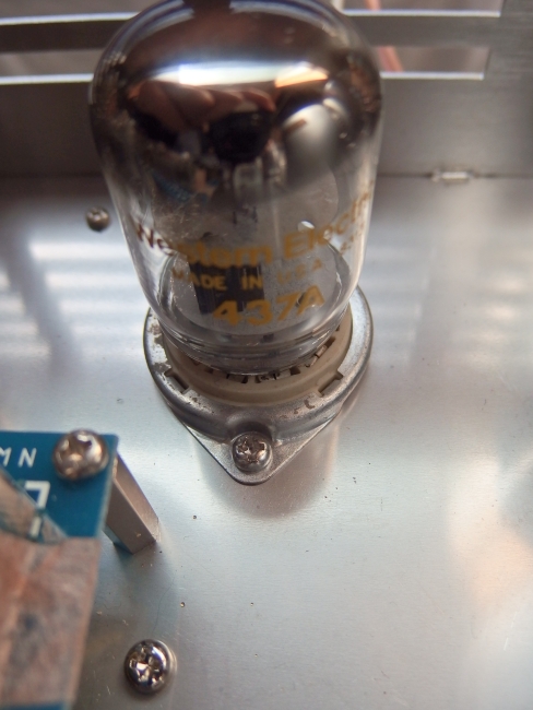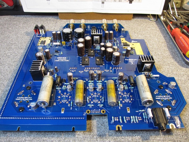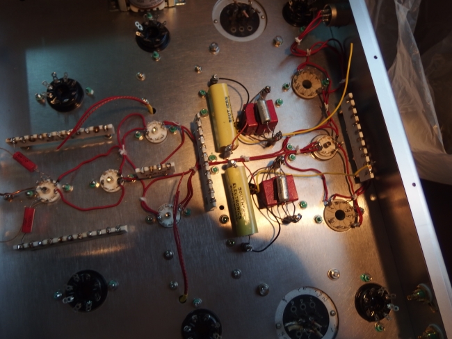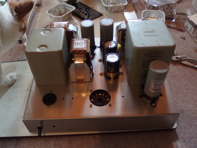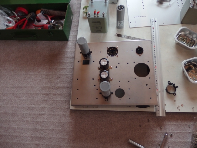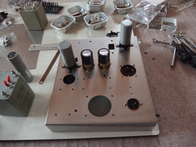 整流管ソケット等を取り付け、ようやく上面の取り付けが終わりに近づきました。 |