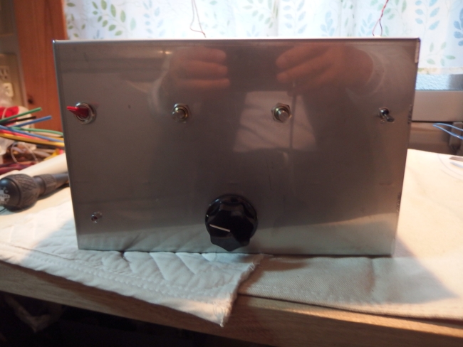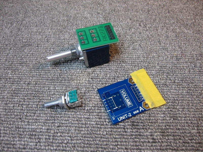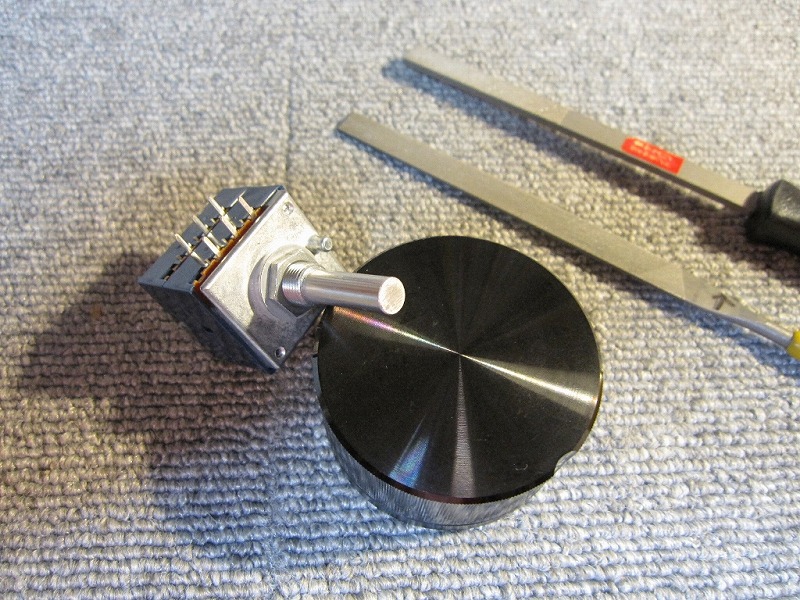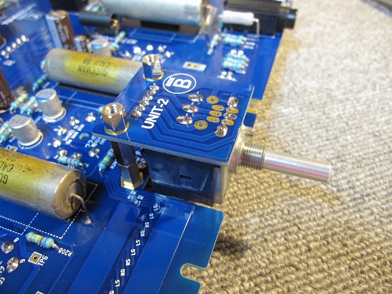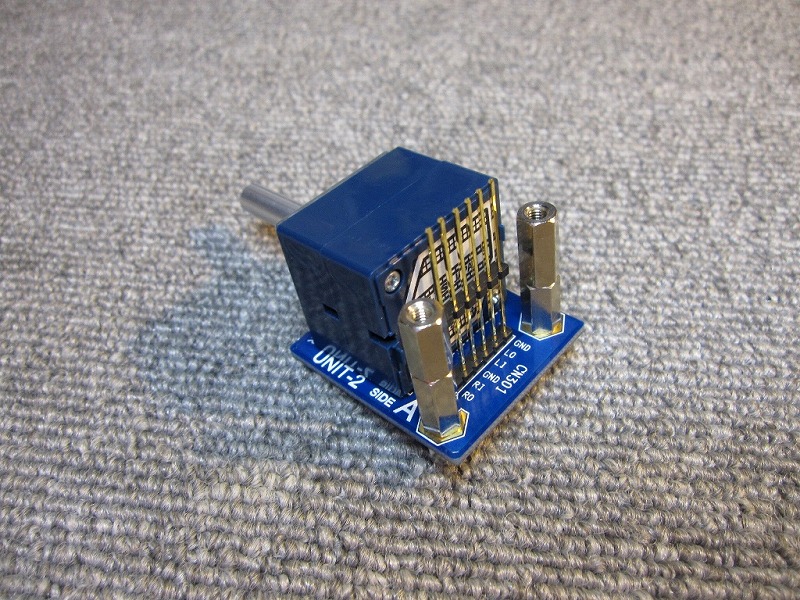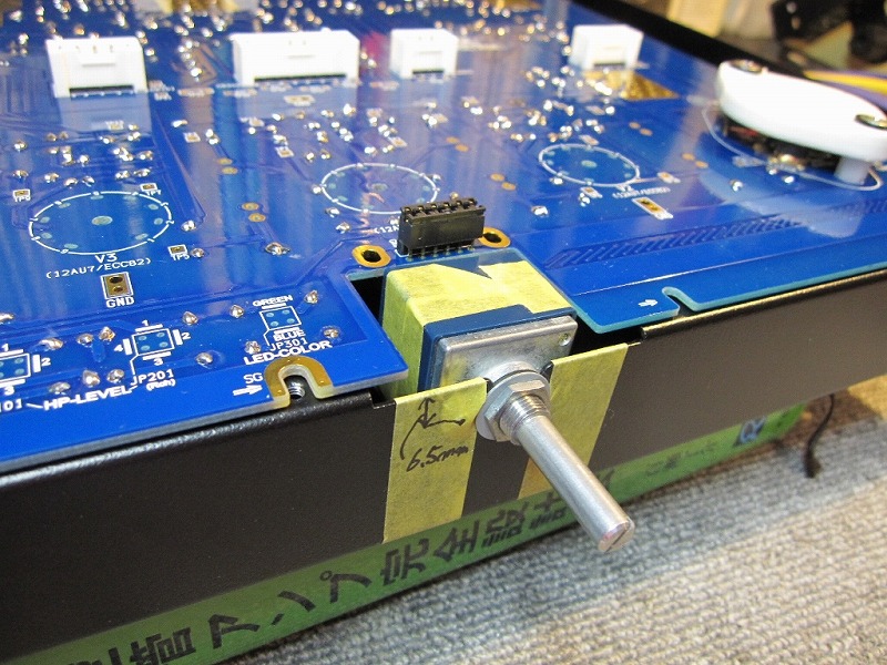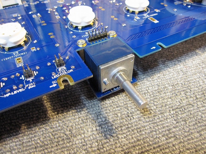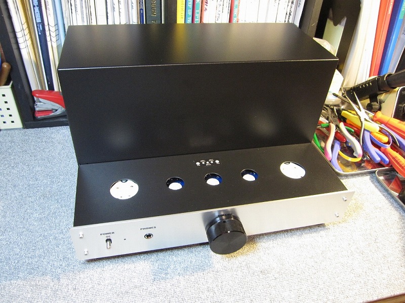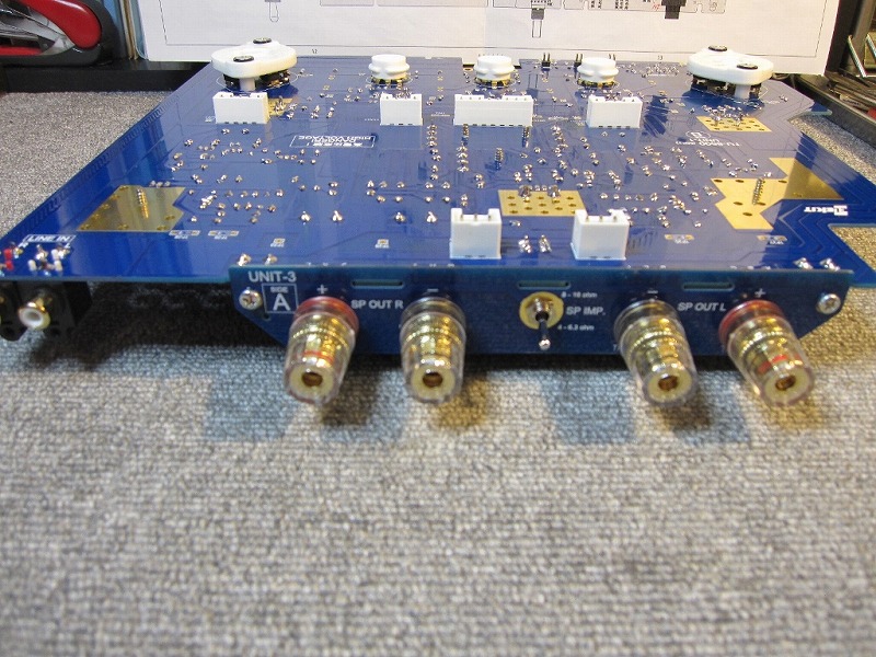 正面です。アッテネーターのツマミを仮付けして音出しをしてみました。 |