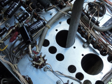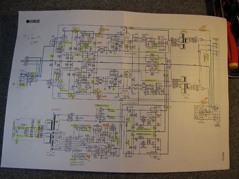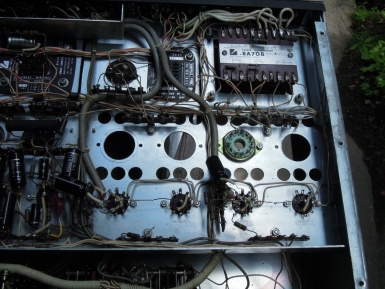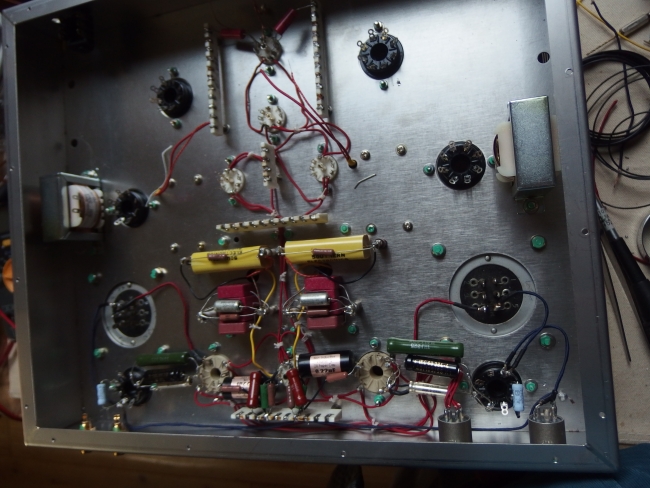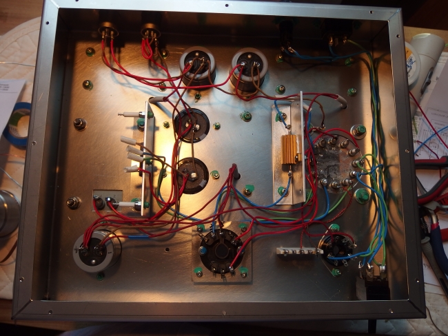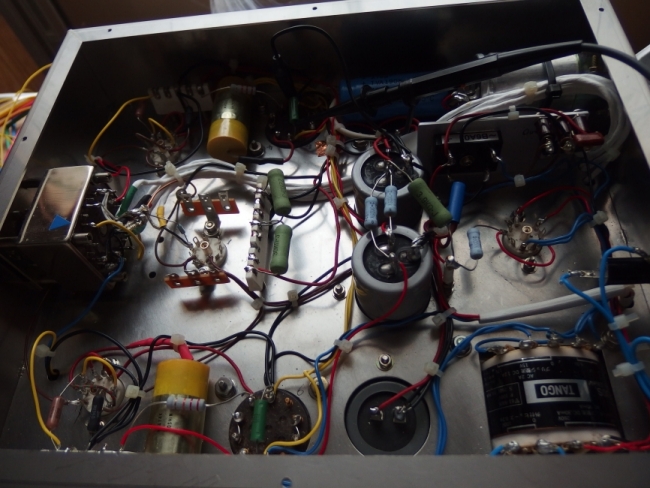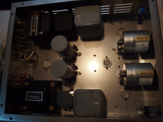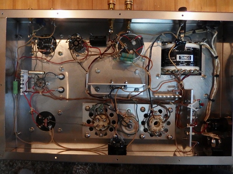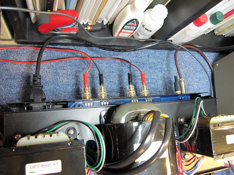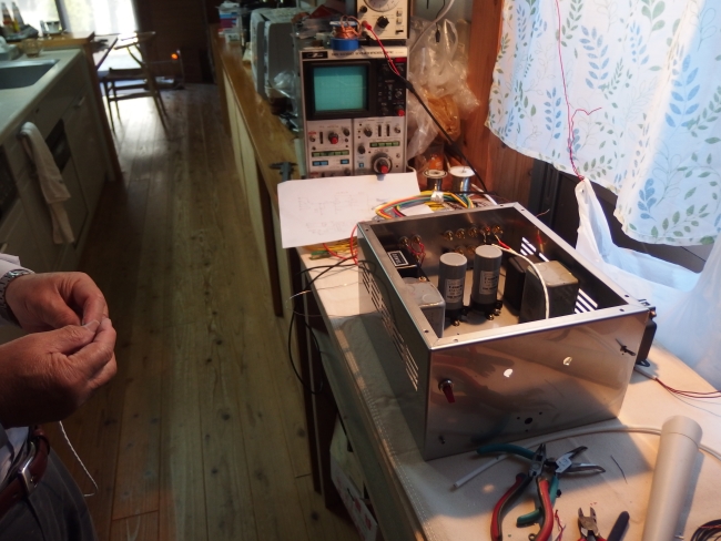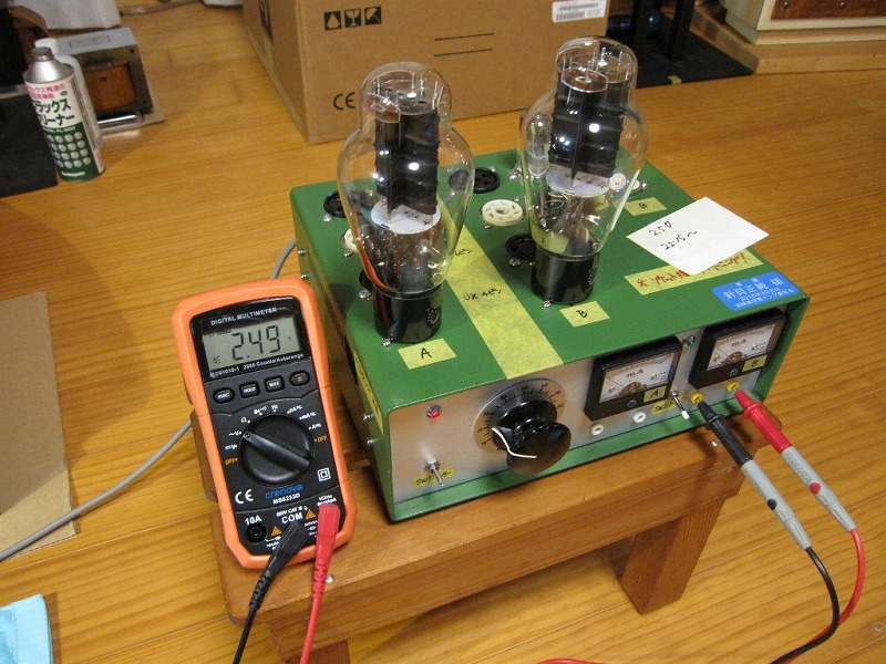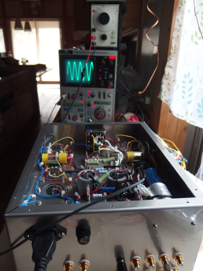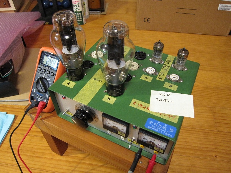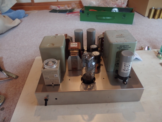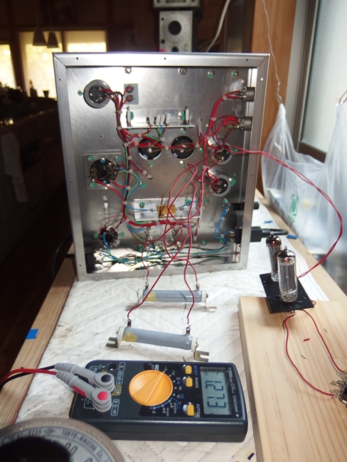 真空管を差して、測定です。WE396AがNGで交換、チョークも出力が低く、取外して(苦労して取り付けたのに)点検し内部配線を交換してようやくOKとなりました。