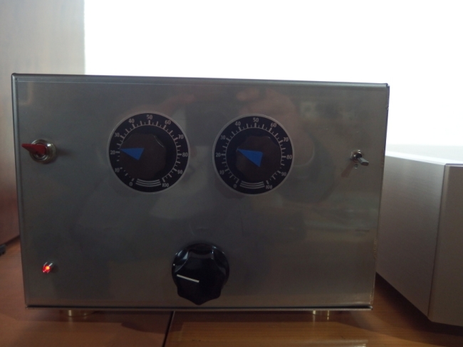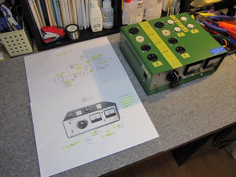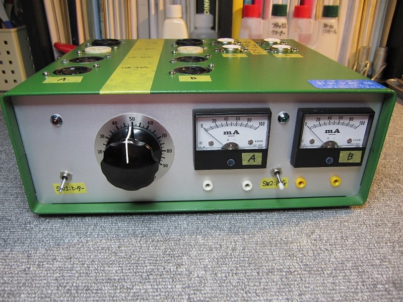 愛好会所有のエージングマシンです(H会員からの寄贈品) ヒーターに電圧をかけるのエージングとプレートとグリッドに低圧を印加して電流を流すエージングの2つのエージング機能があります。左のダイアルは ヒーター電圧の調整用、メーターはプレートとグリッドに流れる電流値を確認するものです。