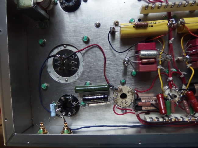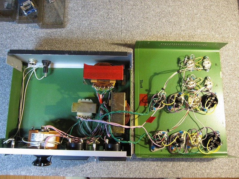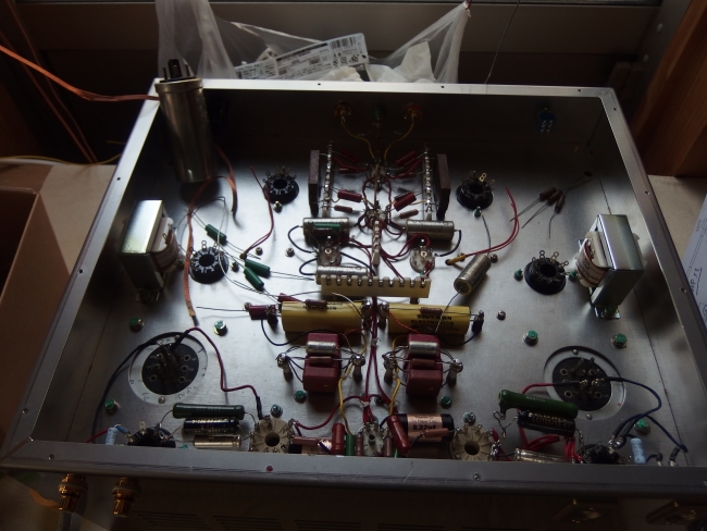 当初の計画では出力段はWE437Aの予定でしたが、1本が故障でした。探しましたが入手できず、安楽会員手持ちのWE418Aで最初の音出しをしました。その後、WE436Aを入手し、採用しました。また、アッテネーターを私の希望でDAVEN DUAL T PADの未使用品を調達してもらったのに1個が故障でした。手持ちの東京高音を使用して音出しをしました。 |