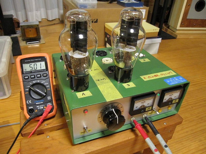 PSVANE WE300Bにヒーターのみ印加します。まず定格電圧5Vの50%、2.5Vで20時間、次に定格の70%、3.5Vで20時間、次に定格100%、5Vでこれまた20時間、 最後にヒーターとプレート・グリッドに印加して20時間エージング、計80時間。電流計の針が動いています(球の定格電流値内であればOK) 合い間にMT管もやってますね。 アンプ製作の間を使ってのエージングです。