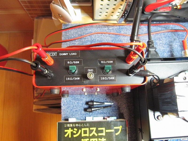 ダミーロード(自作品) アンプのスピーカー端子に接続します。中身は抵抗で8Ωと16Ωの切替が出来ます。アンプ測定でスピーカーを繋ぐと盛大な音は出る、スピーカーのインピーダンスは周波数によって変化するので、きちんと測定出来ません。そのためスピーカーの代わりに純抵抗のダミーロードを繋ぎます。 測定で音を聞きたい場合にはスピーカーを繋ぎますよ。