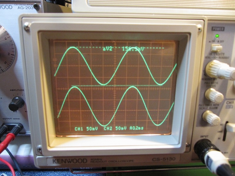 片chの入力に発信器とオシロ入力(上側)、出力にオシロ(下側)を繋ぎ、入力と出力の差異を観測します。信号は正弦波、1KHzにて(波形のサイズは同じになるように調整しています) ほとんど差異はありませんね。