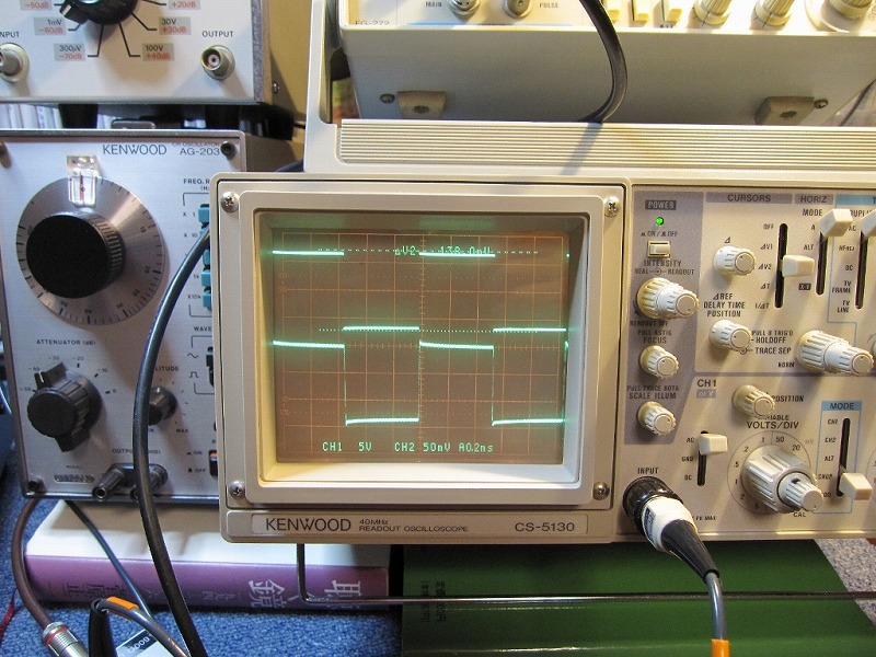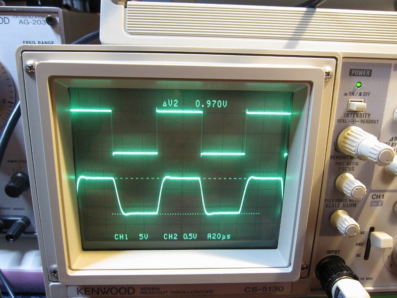 | 今度は方形波、1KHzです(方形波応答測定) 波形が変化していますね。この形でアンプの立上り、立下り時間やスルーレートを測定します。 |