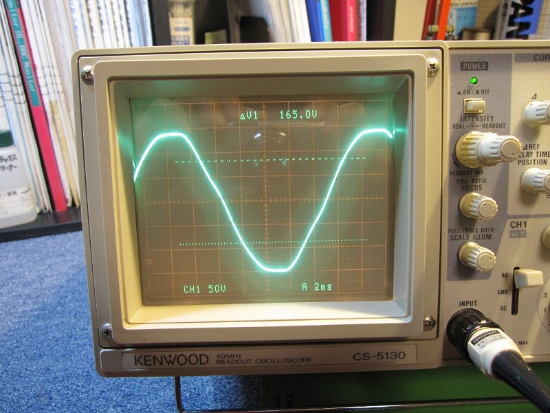 参考に家庭電源100Vの波形です。綺麗な正弦波でなく頭がつぶれており滑らかな形でないですね。電力会社からの商用電源は汚れていますね。