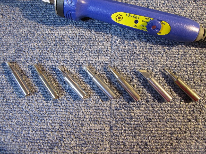 ハンダゴテを購入したときについてくる円錐状のもの(一番右)は、あまり使えません。真空管アンプの端子や基板では先が斜めのものや、マイナスドライバー状のものがよいです(写真、左から5番目まで)それぞれサイズがあります。コテがゴロゴロしている強者もいらっしゃいます(笑)