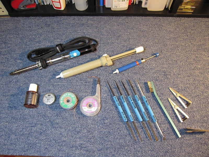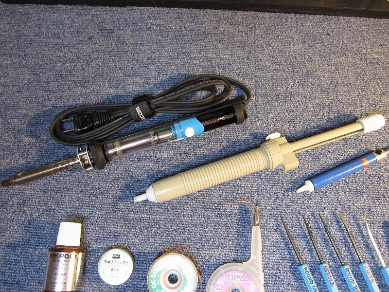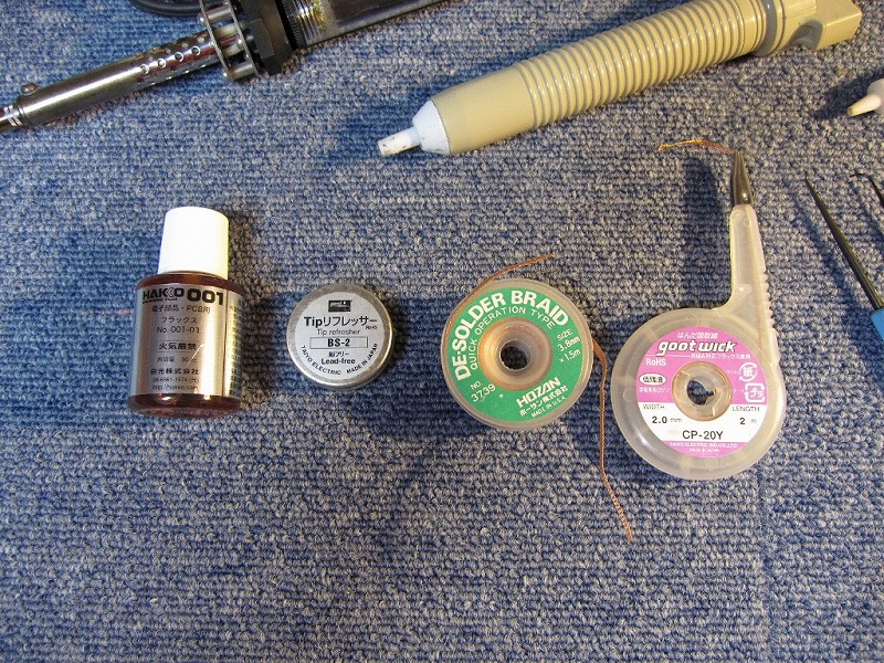| 左からフラックス(ハンダの乗りをよくするもの)、チップリフレッサー(コテ先の酸化・劣化を防ぐもの)、ハンダ吸い取線(銅の網線です) |