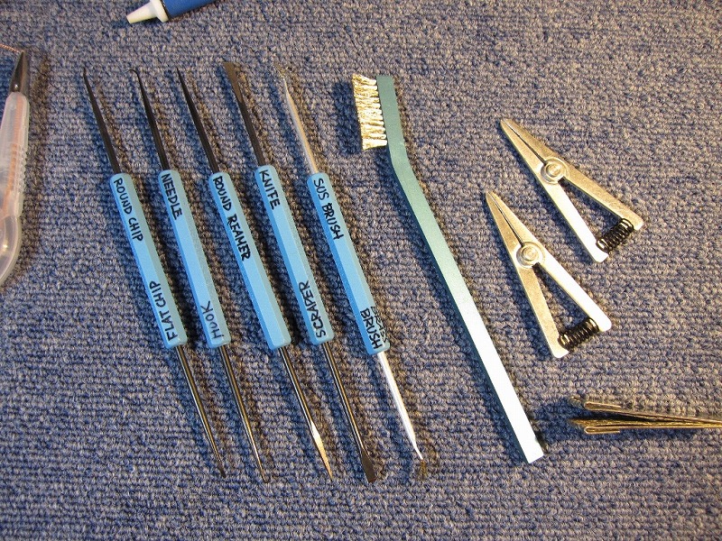 | 左から、基板ハンダ作業補助器具(青色柄、フック、ナイフ、スクレーバー、リーマーなど)、掃除用アルミブラシ2種、ヒートシンク(ハンダ付け時の熱から部品を守る放熱クリップ) |