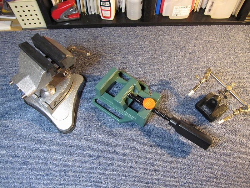 | 部品類固定器。左から、卓上万力、バイス、部品・基板固定器。あると便利なモノたち。 |