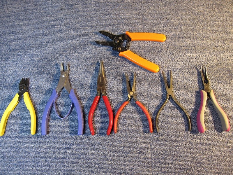 | ハンドツール類、左からニッパー2種(diagonal cutting pliers)、ラジオペンチ4種(needle-nose pliers) 略称はラジペン、上段はワイヤーストリッパー(線の被膜剥き器) |