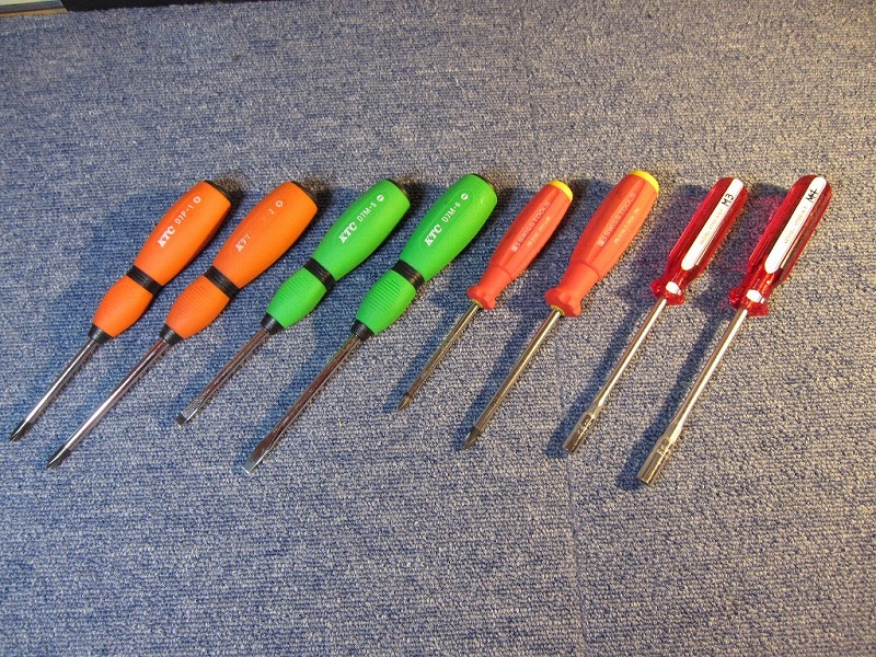ドライバー類(screwdriver)、左からプラスドライバー2種(KTC社)、マイナスドライバー2種(KYC社)、プラスドライバー2種(PB社)、ナットドライバー2種(ベッセル社)