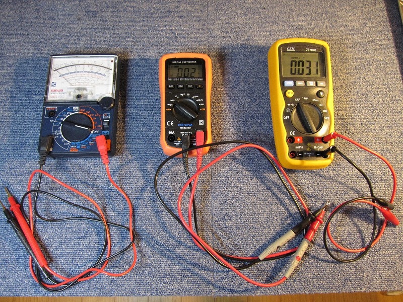 | 測定器、左からアナログテスター(sanwa社)、デジタルマルチテスター(中国製)、LCR測定器(中国製、L:コイル、C:コンデンサ、R:抵抗の値を測るもの) |