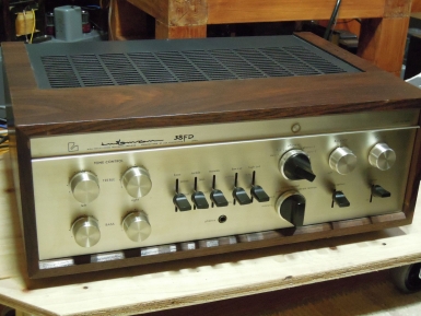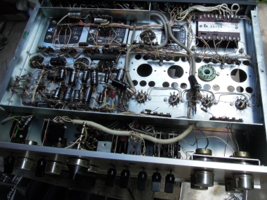 ラックスSQ38FD外観とシャーシ内部(中央部右の出力管付近はソケットなど取り外しの途中) |