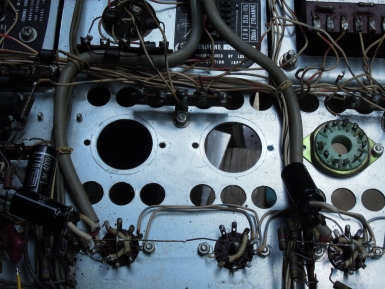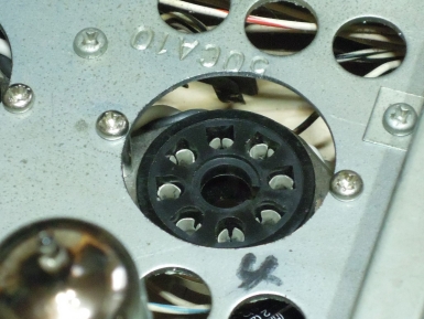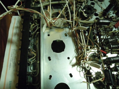 シャーシ上面から見た6CA7ソケット取付け穴の様子。直径37ミリくらいに広がった。