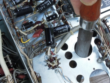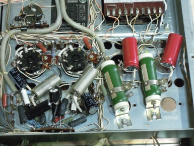 古い山水のチョークコイルの取り付けです。分解して錆を落として塗装しました。取り付けるスペースが狭くて悪戦苦闘、安楽会員が手伝ってくれました。