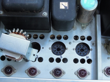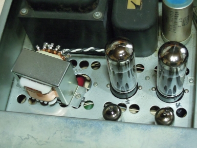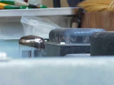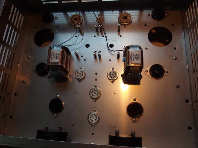 6CA7用ソケットを取り付け、ヒータートランスも配置。6CA7を差してみたらうまくいった。 |