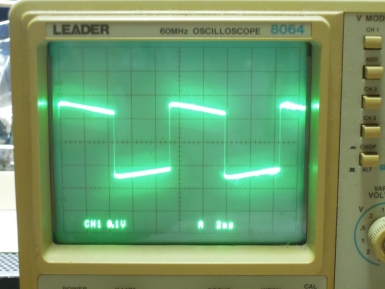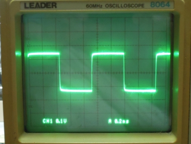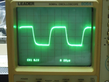 方形波、10KHz。周波数が上がると角が丸くなり、立上り時間が少々遅くなります。
