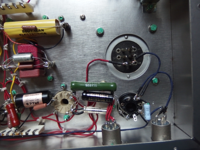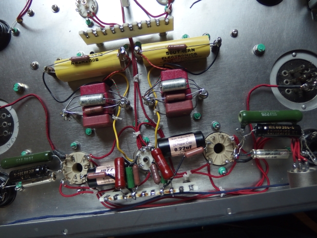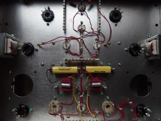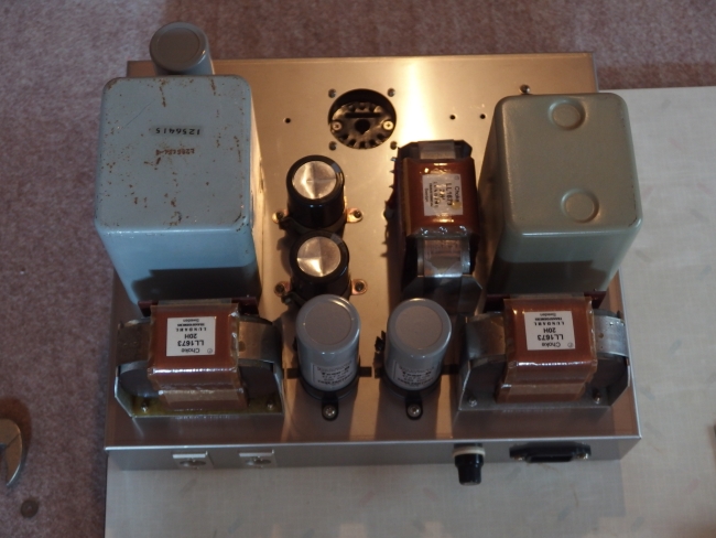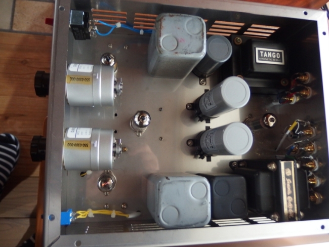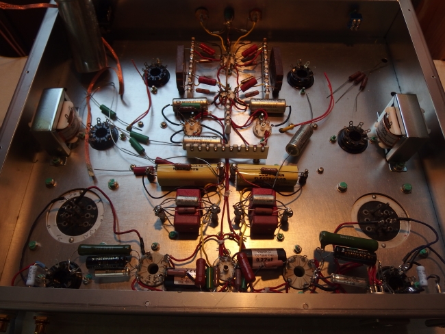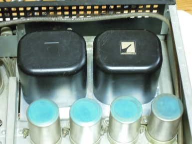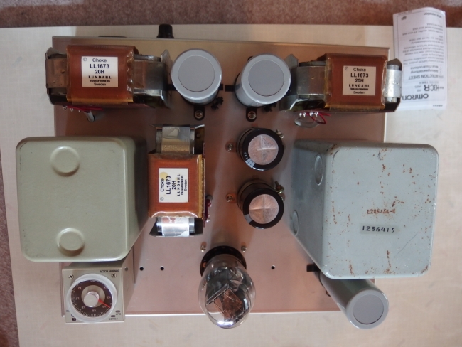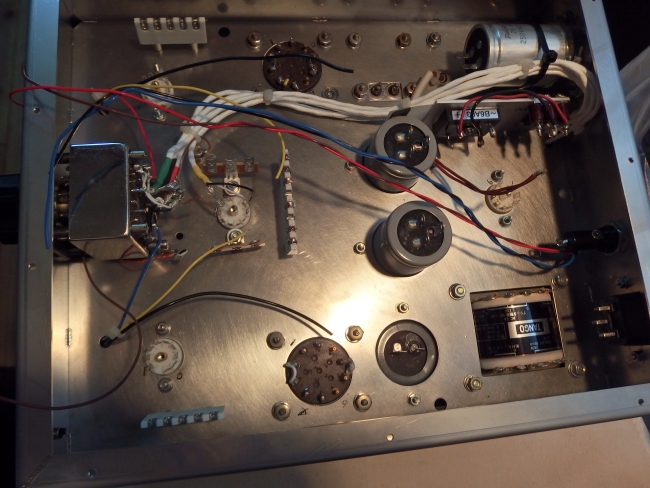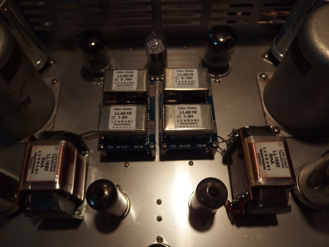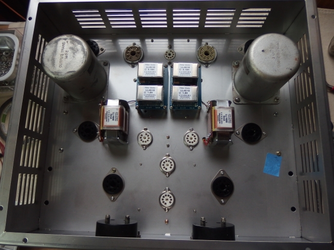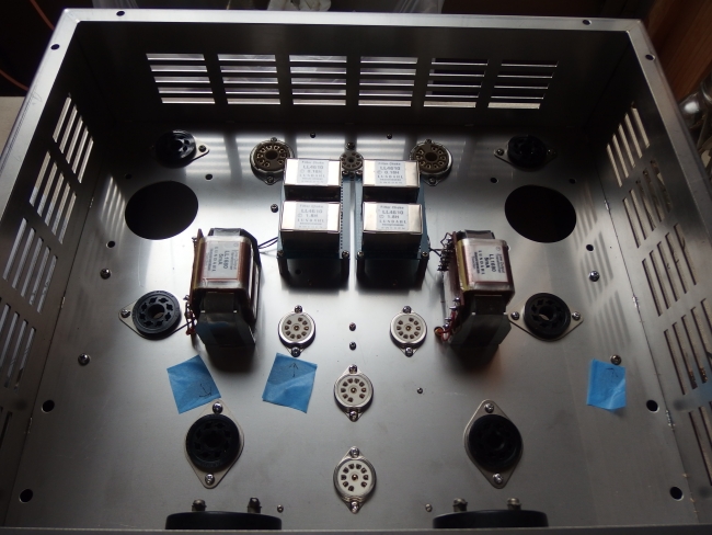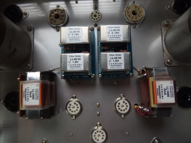 水色の電源トランス(UTC)、灰色はヒーターチョーク(Bendix)、茶色の3個がルンダールのB電源チョーク。ルンダールは、以前に300Bアンプで使用して気に入ったので、今回も使用しました。 |