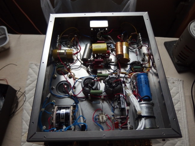 2年前に300Bシングルアンプを安楽会員の指導のもとに作成し評判が良かったので、身の程知らずにLCR型イコライザープリアンプに挑戦しました。構想半年、部品収集に半年で作成に着手し、途中部品トラブルにより設計変更がありましたが半年かけて何とか完成しました。完成後も、300Bアンプとのマッチングのため、当初付けていたRCA5814は取り外しました。また、300BアンプもRCA5814をWE272Aに変えました。現在は、とても良い塩梅でタンノイメモリーが鳴っています。ご協力いただきました皆さんありがとうございました。