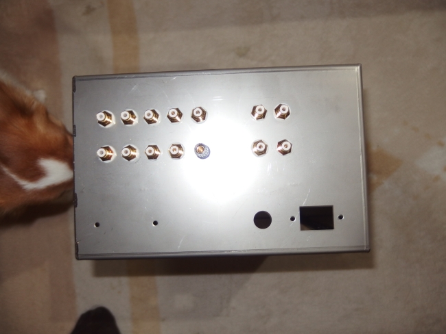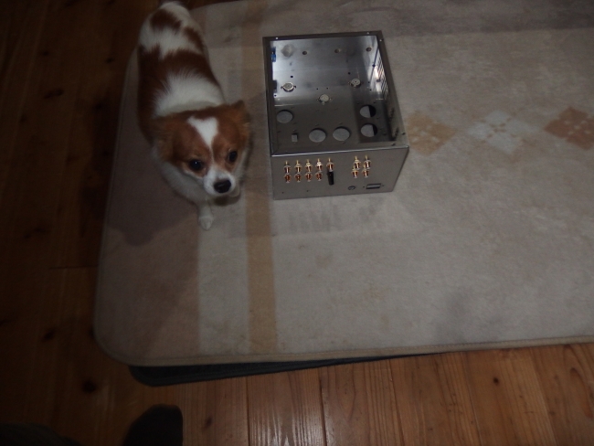 アッテネーターが変わったので、取付け穴を新たに開けるところです。シャーシがステンレスで硬く、なかなか大変です。山本会員が工具持参で応援に駆けつけてくれました。安楽会員の愛犬ジョナサンも見ています。 |