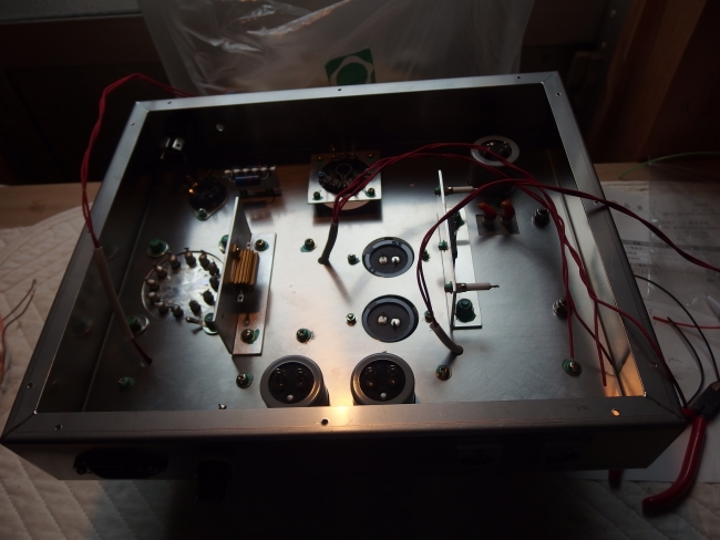 漸くステンレスシャーシが届き、部品もある程度そろったので、12月末から作成開始となりました。先ずソケットの取り付けが終わったので、球を挿してヒーターが灯るのを喜んだところです。 |