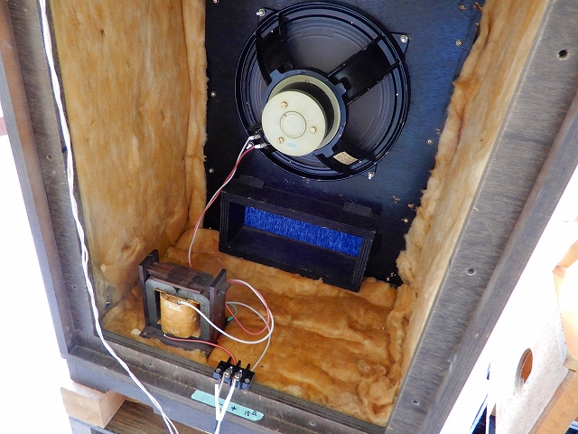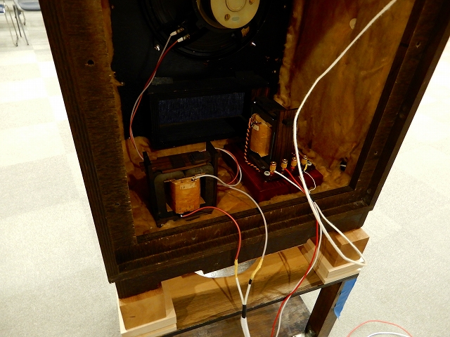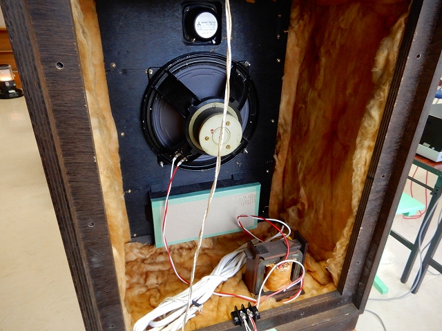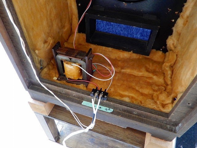 | ウーファ、ツィーターそれぞれにマッチングトランスを入れてます。逆起電力抑止に大きな効果。 |