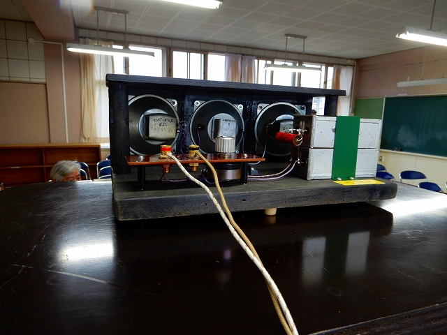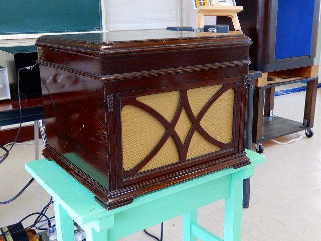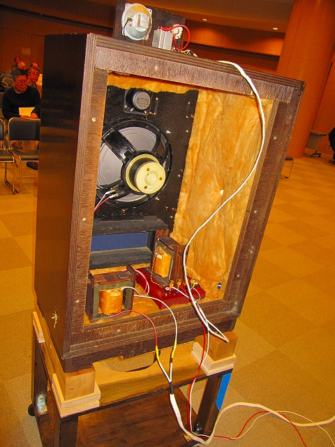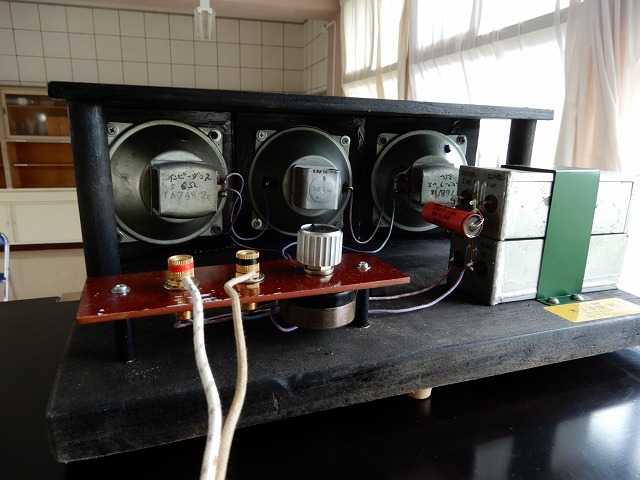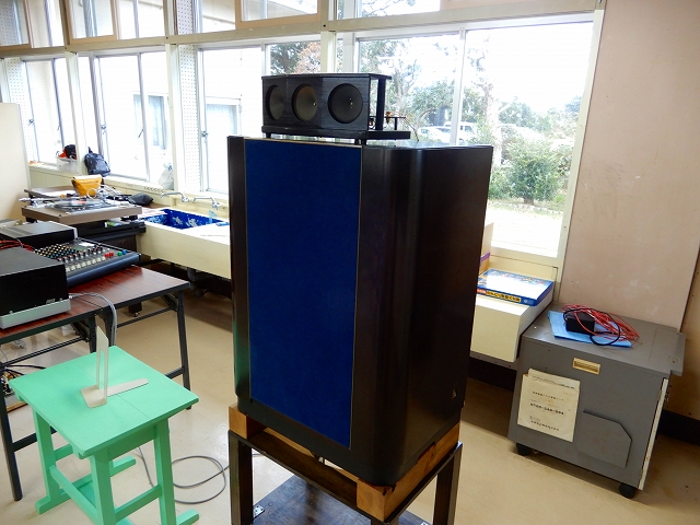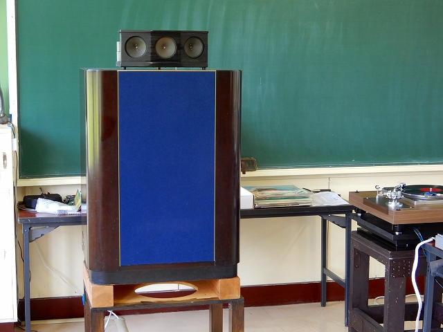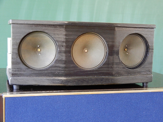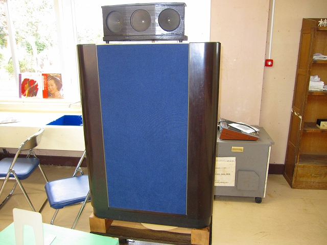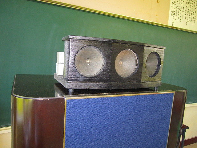 | 三菱2S-305の箱を利用したスピーカーシステム 宮崎市立図書館ではアルテックA7を使っていますが、出前コンサートではこのスピーカーを使用しています。ユニットはロシアクラングフィルム製 後面開放型 |