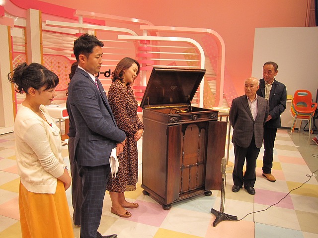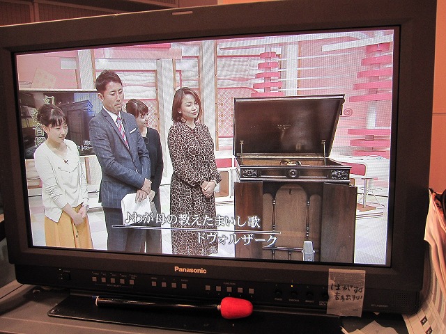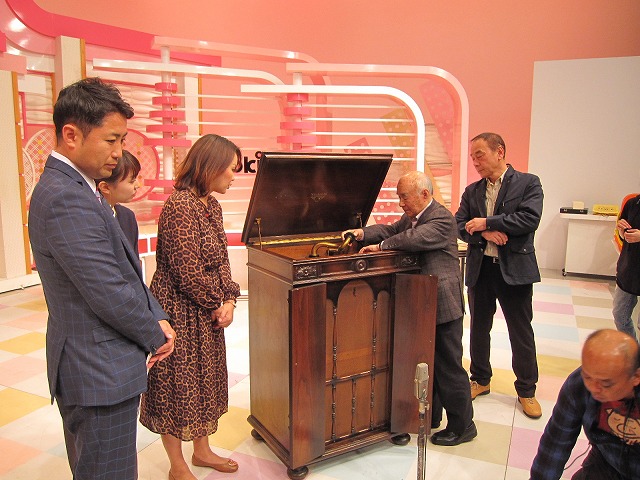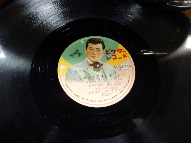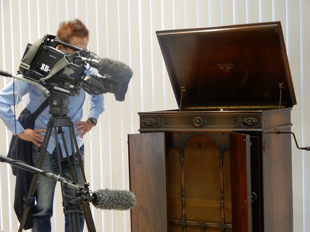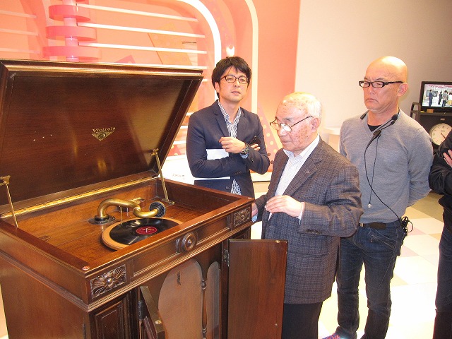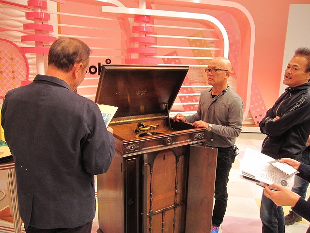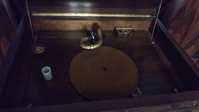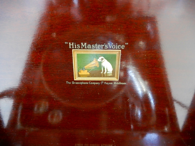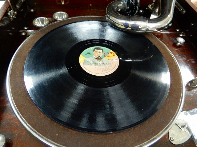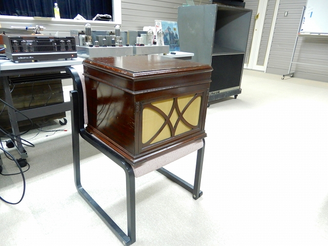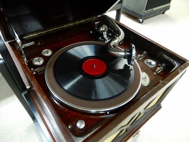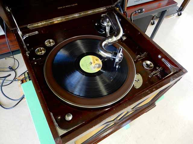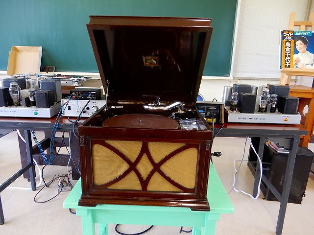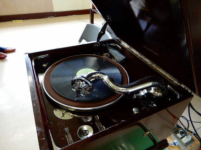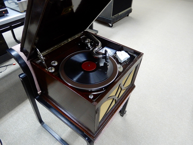 | 万一のクレデンザ不調に備えて小型の蓄音機、【イギリス製"HIS Master Voice" The Gramphone Company HMV-130】を予備として用意しましたが、クレデンザは正常に動作したため、出番は有りませんでした。 |