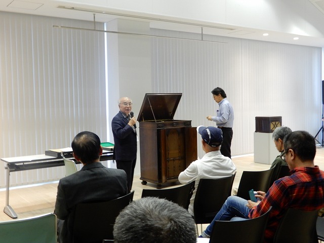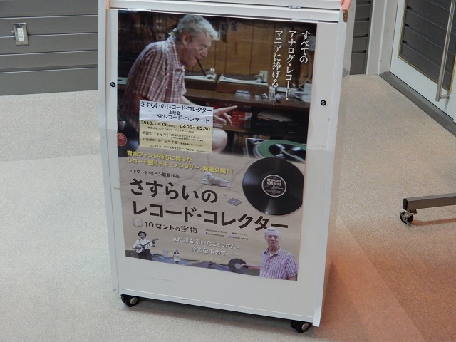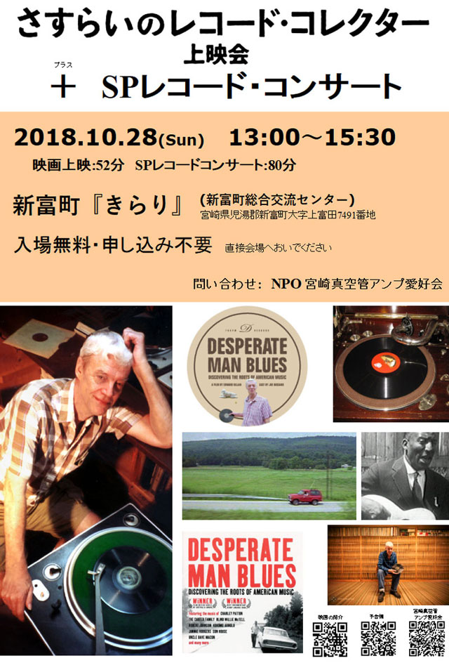 | 好天に恵まれた2018年10月28日、新富町総合交流センター「きらり」で映画『さすらいのレコードコレクター~10セントの宝物』の上映会と併せて、蓄音機の最高峰『クレデンザ』によるSPレコードコンサートを行いました。『さすらいのレコードコレクター』は2003年、オーストラリアの映画、エドワード・ギラン監督作品です。米国メリーランドに暮らす最強のレコードコレクター、ジョー・ハザードを扱った映画で、とてもマニアックな映画であり、宮崎の映画館ではまず、かかることは無いとの思いから、宮崎真空管アンプ愛好会として、上映会を企画しました。また、映画の主人公、ジョー・ハザードがSPレコードコレクターであることから映画上映に合わせてSPレコードのコンサートを企画しました。電気を使わないアコースチック蓄音機の最高峰、『クレデンザ』でSPレコード、Home Sweet Homeから、センチメンタル・ジャーニーまで17曲を聴いて頂きました。 |