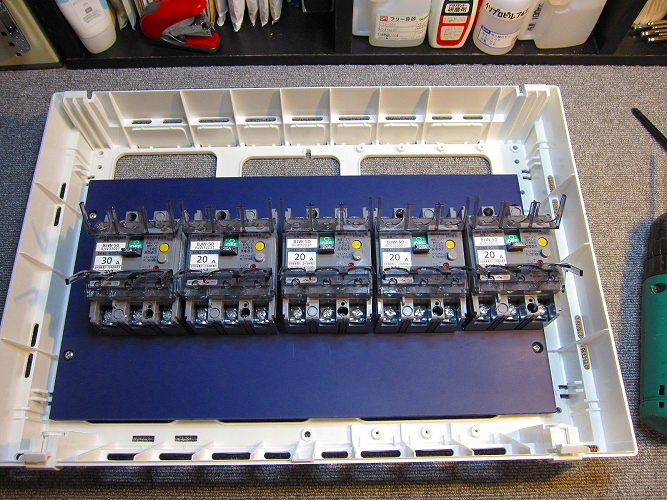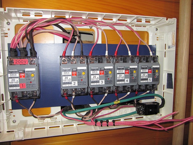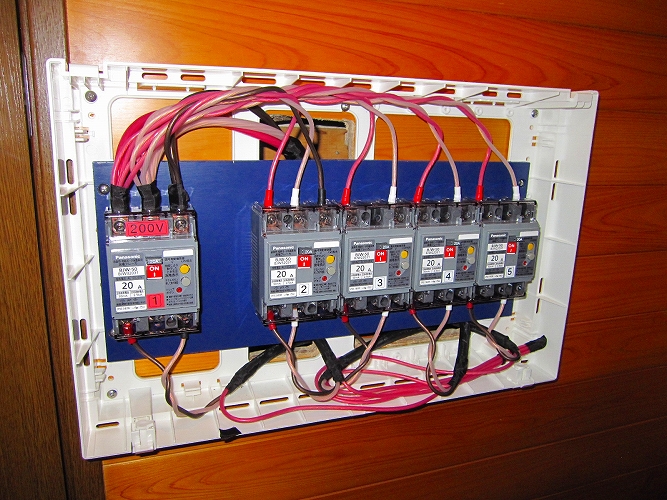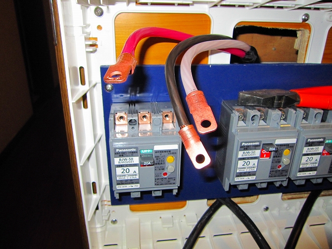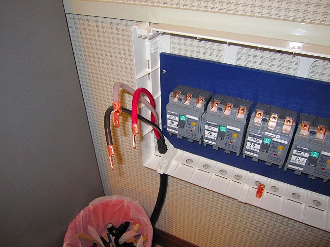 改修後のブレーカー ブレーカーの出側で生活用電源とオーディオ用電源を分離します。