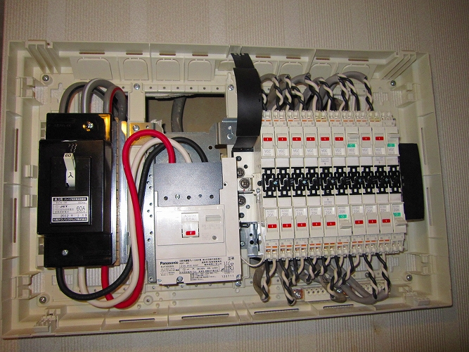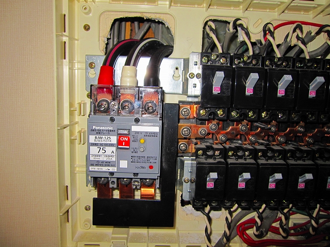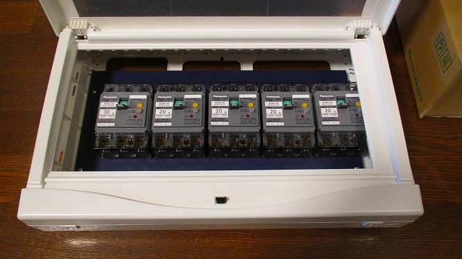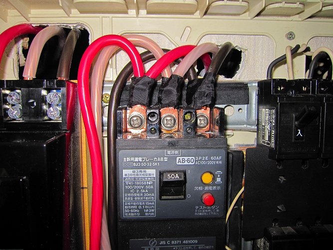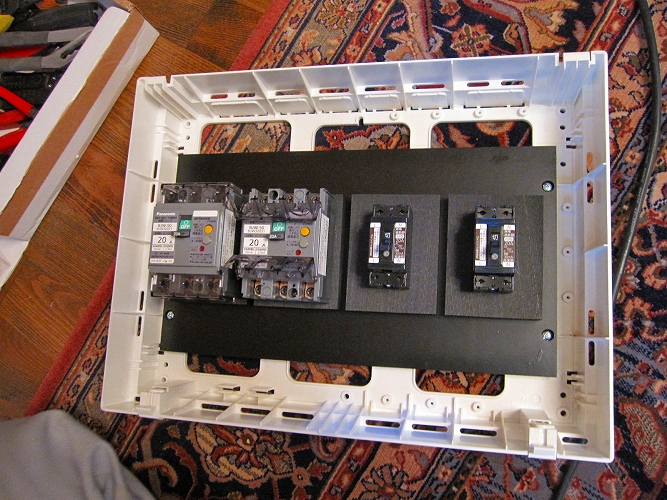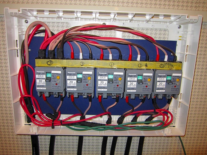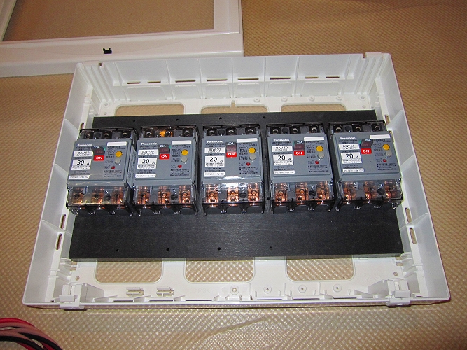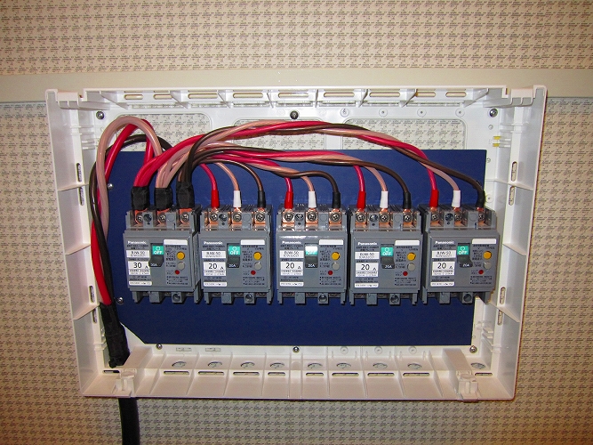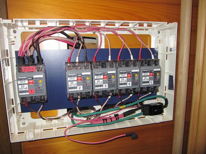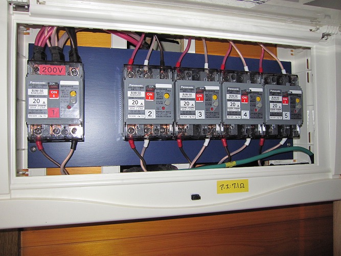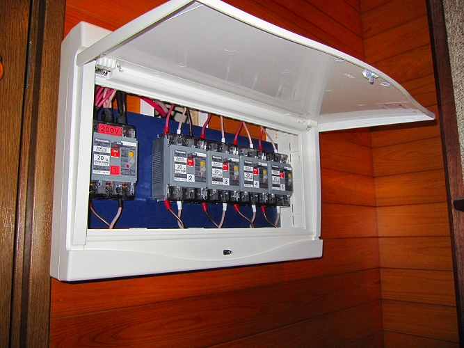 | 改修後の主分電盤(生活用電源)漏電ブレーカーも防振処理がしてあります。 |