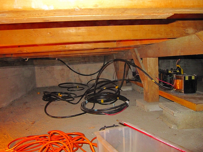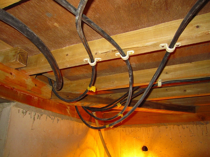 | オーディオ専用電源の天井裏配線の様子。 配線はCV22-3C。 不要振動を逃がす為に、あえてガッチリ固定することはせずに軽く留めます。このあたりもノウハウのひとつ。 |