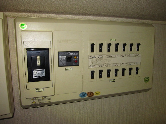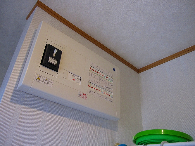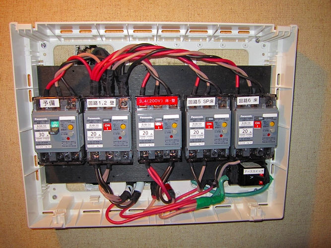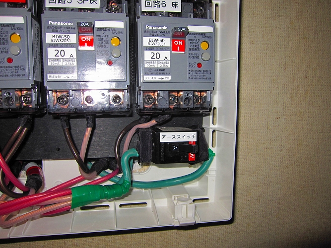盤右下の小さなブレーカーは、アース回路を切るためのものです。以前、ご自宅の電力引き込み柱の雷が落ちたことがあって電化製品に被害が発生しました、雷害ですね。雷の高圧電流は電柱の電力線から侵入するものや避雷針で地中に逃げたものが接地から廻ってくるものなどがあり、その防止のためです。雷が発生しそうなとき、ブレーカーを切ります。