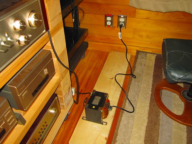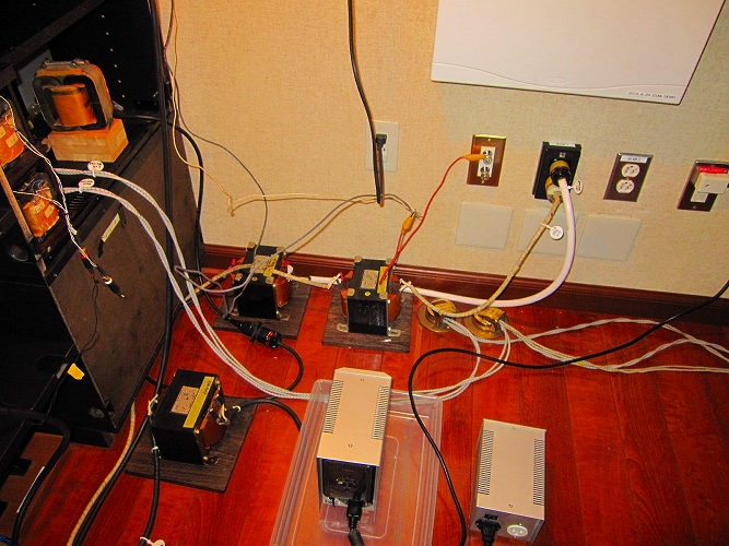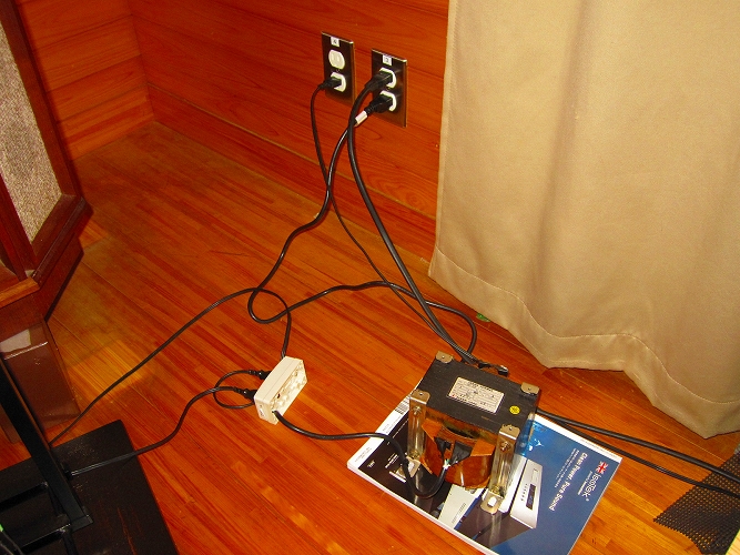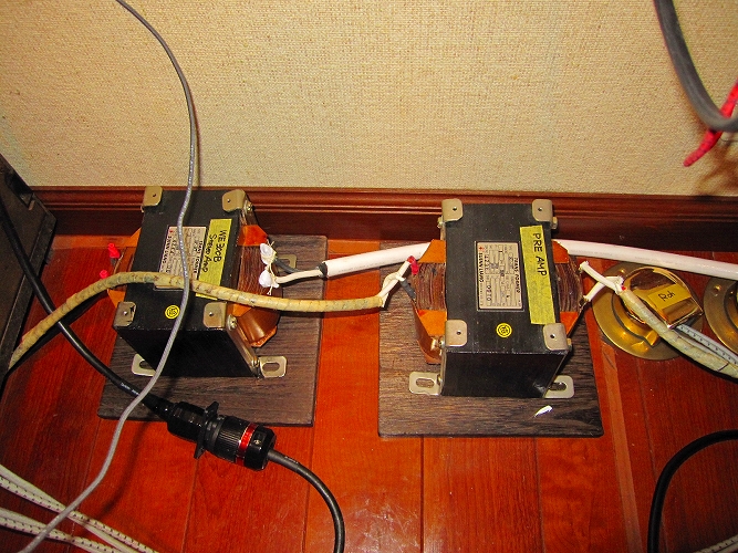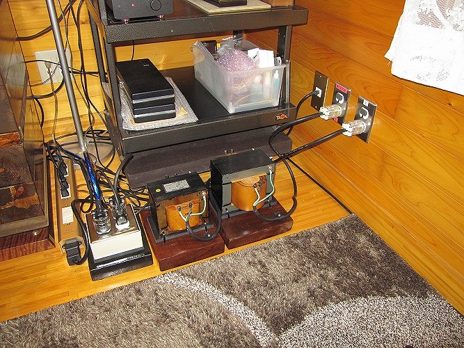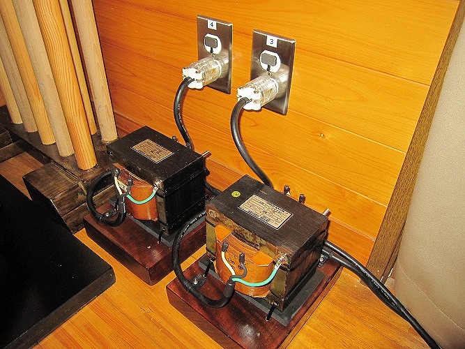 なぜトランスという介在物を電源に入れるのか?これは電源のノイズ対策です。B会員宅は電源改修工事を行っており、電灯盤からオーディオ用盤を分岐して設置してあります。これだけでもノイズは大幅に減るのですが、家庭内で使用している電化製品からのノイズは強力です。ノイズは外部から電源線を伝わってくるもの、電波でくるもの、オーディオ機器本体から発するものなど多々あります。これらを少しでも減らし、音質を高めるためにアイソレーション(絶縁)